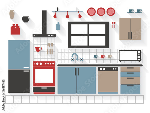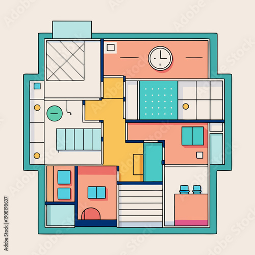 Vector top view color architectural floor plan of one bedroom apartment. Modern dining room, bedroom and bathroom interior with furniture.