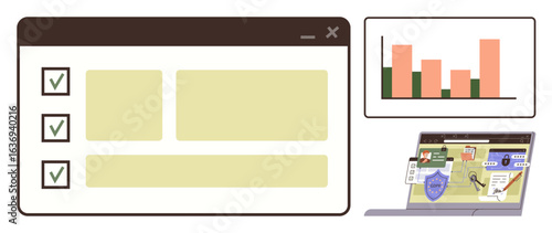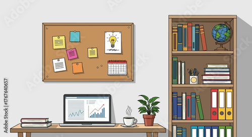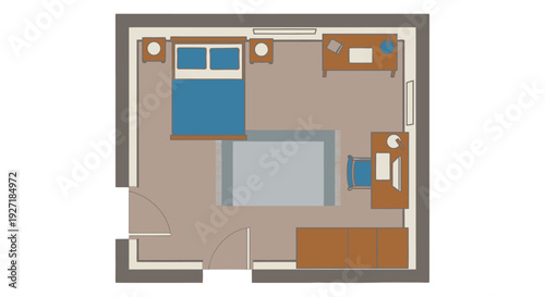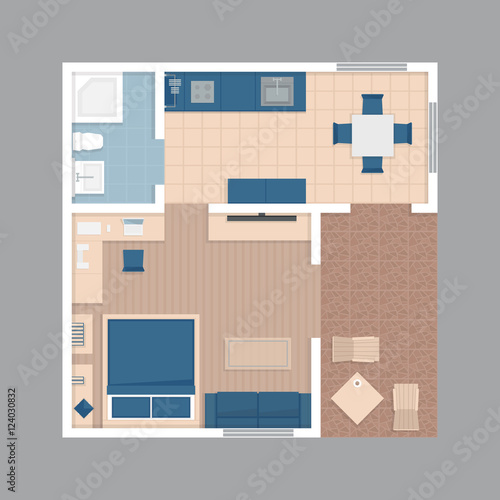 Vector top view color architectural floor plan of modern studio apartment which combines living room, bedroom and kitchenette with furniture.