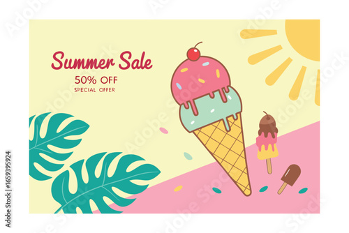 Vector paper art style ice cream vertical banner set. Delicious ice cream cones in bright colors against summer background. Ice cream ad design templates.