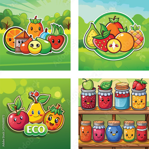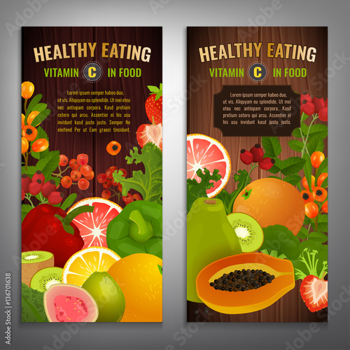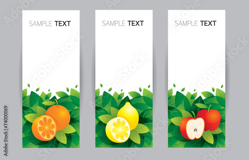 Vector set of fruit banners with paper cut ripe fresh red apple, yellow pear, apricot and plum summer fruits.