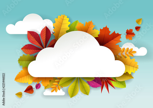 Vector paper cut autumn leaves and cloud shaped frame with space for text. Origami autumn frame template.