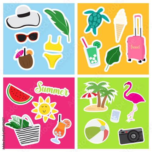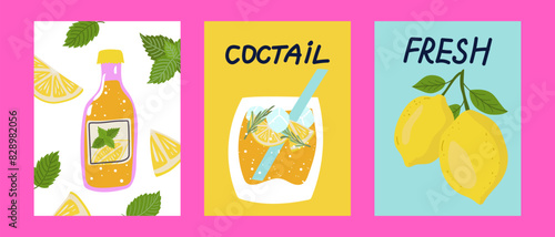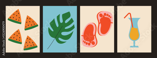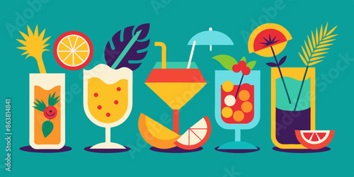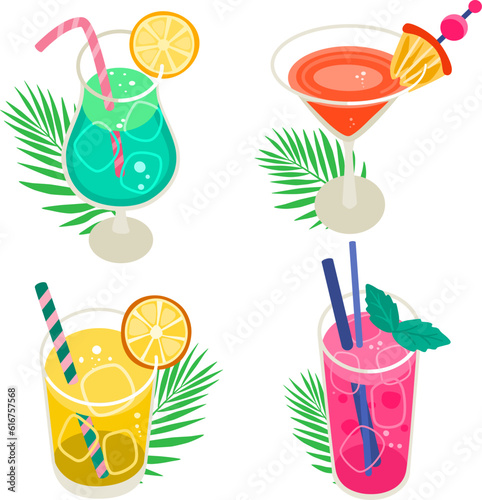 Cocktail summer drink card set. Vector paper cut illustration. Tropical party invitation poster design templates with beautiful exotic tropical flowers, palm leaves and cocktails.