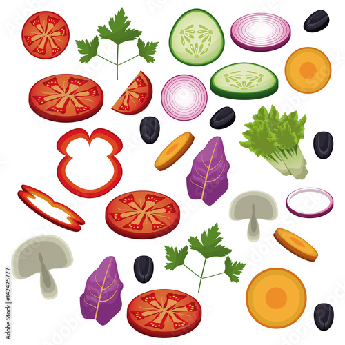Vector paper cut craft style fresh vegetables and greens. Carrot, asparagus, beet, tomato, eggplant, cucumber, garlic, onion, pepper, celery broccoli peas. Natural organic food and healthy nutrition.