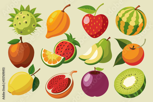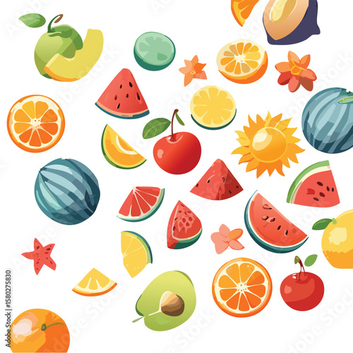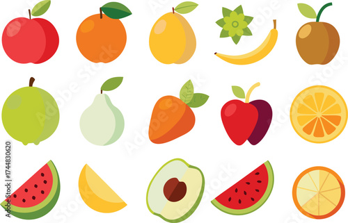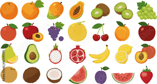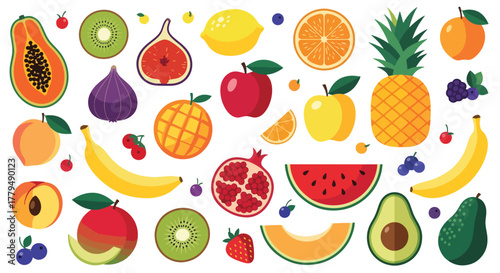 Vector paper cut craft style fresh summer fruits and berries. Sweet watermelon slice, apple, plum, pear, cherry, kiwi, orange, lime, pomegranate, strawberries and tropical fruits. Healthy diet food.