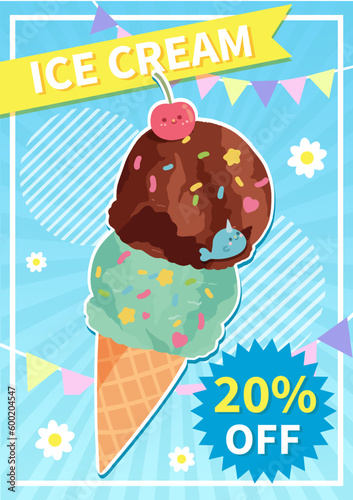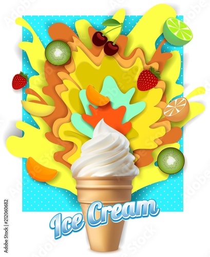 Fruit ice cream poster banner design template. Vector paper cut ice cream cone with fruit juice splashes and fresh starwberry, cherry, sliced kiwi, lime, mango, orange.