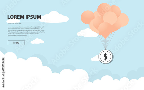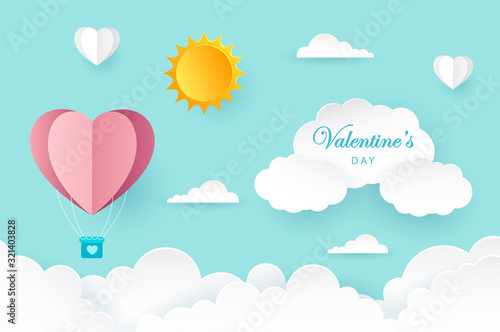 Daylight sky with sun, white clouds, flying hot air balloons, snowy mountain peaks and copy space. Vector illustration in paper art style. Mountain background, poster, flyer, banner template.