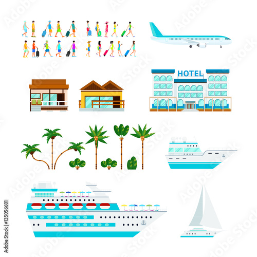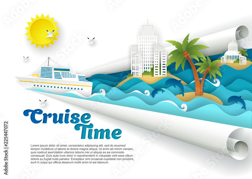 Sea cruise landing page website template. Vector paper cut cruise liner floating on ocean waves, dolphins, seagulls, islands, tourist resorts. Sea voyage concept.