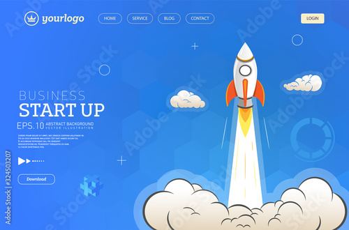 Road to space landing page website template. Vector paper cut rocket launch, sky, planets, stars. Space trip concept, paper art style.