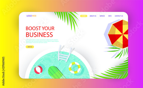 Summer camp landing page website template. Vector paper cut illustration of campfire and tent near lake on forest and mountain background. Summer camping, hiking, trekking concept.