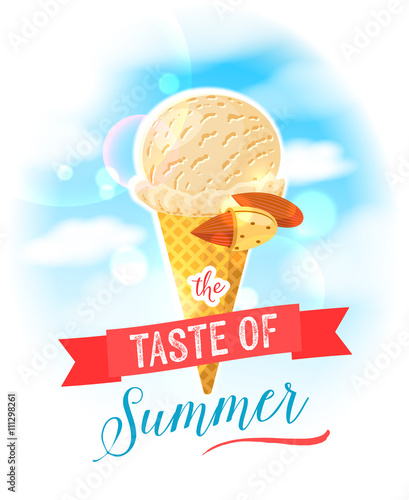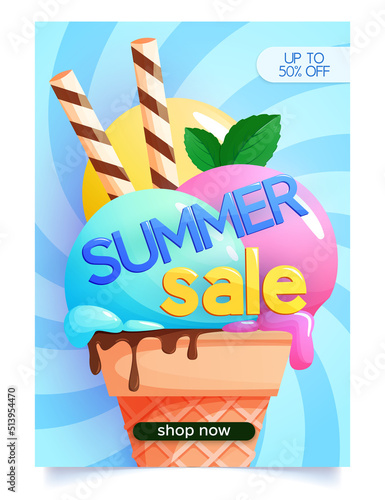 Tropical fruit ice cream poster design template. Vector paper cut ice cream cone with fruit juice splashes and fresh sliced kiwi, lime, mango, orange.