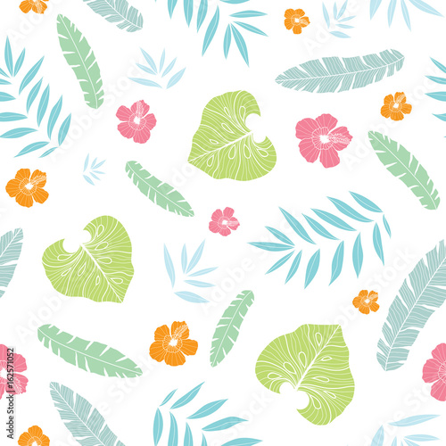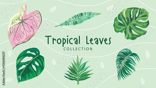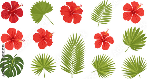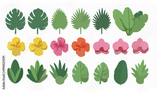 Tropical plant set. Vector paper cut monstera, bamboo, cocos palm leaves, hibiscus hawaiian aloha, frangipani flowers etc. Modern craft style design elements for party invitation greeting card poster.