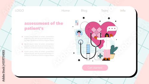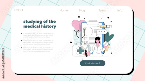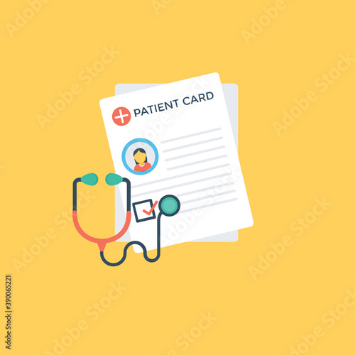 Vector patient medical card or vaccination certificate illustration with stethoscope, loupe and thermometer. Medicine, insurance and healthcare concept