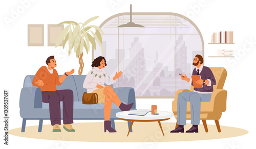 Vector people passengers of business class in airplane illustration. Elderly woman and young female travelling with dog in cage. Aircraft board interior. Inside plane