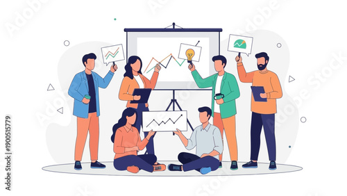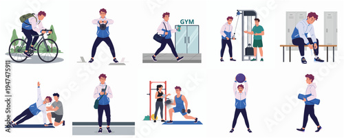 Vector people of different age walking on city street illustration. Man and woman, teenager student and children over cityscape background. Busy citizens in megalopolis