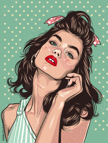Vector illustration of beautiful sexy brunette woman. Pretty pin-up girl with green eyes in pop art retro comic style.