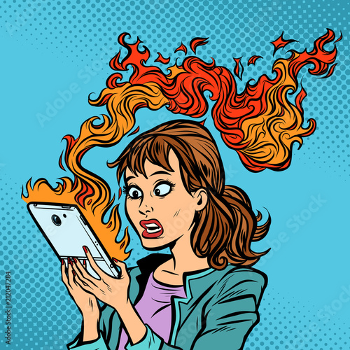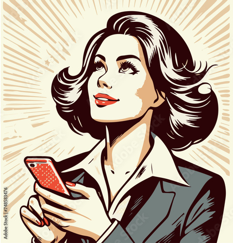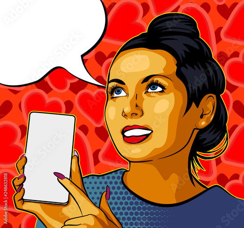 Vector illustration of young woman holding blank card. Beautiful girl portrait in retro pop art comic style.