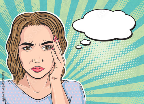 Vector illustration of beautiful young woman with open palm. Girl showing cloud with fidget spinner stress-relieving toy symbol in pop art retro comic book style.