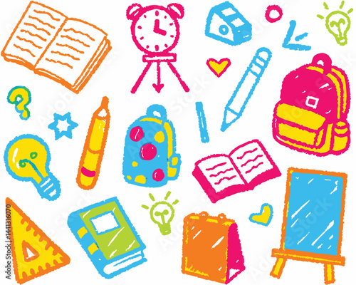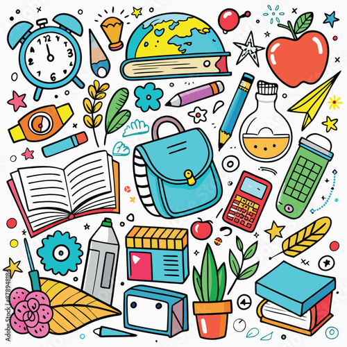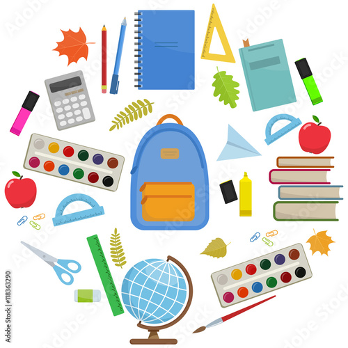Vector pop art comic style fashion school patches, stickers set with pen, pencil, backpack, scissors, eyeglasses, calculator, paints, glue, loupe ruler exercise book and shoes.