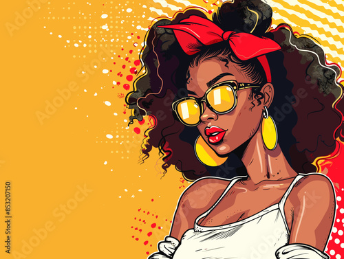Vector illustration of cute fashion woman in blue short dress and blue sunglasses. Sexy pin-up girl in retro pop art comic style.