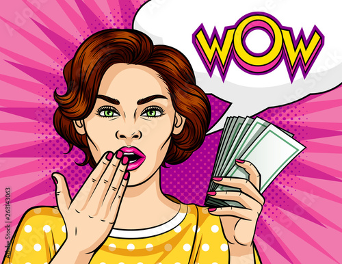 Vector illustration of beautiful girl with cup of hot coffee. Sexy pin-up girl in retro pop art comic style.