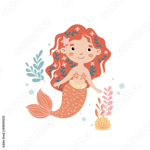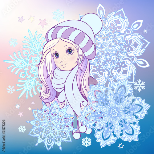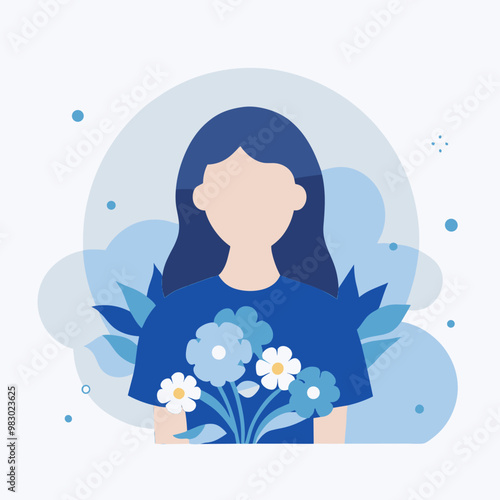 Vector illustration of young girl standing back and peony, forget-me-nots flowers around her in retro pop art comic style.