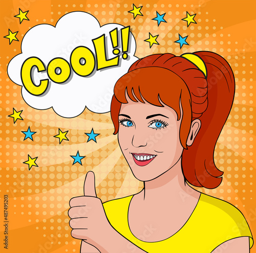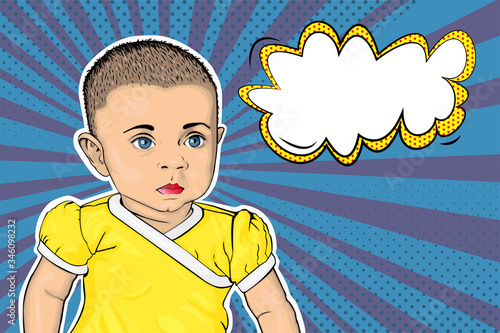 Vector illustration of beautiful african american flight attendant, speech bubble. Stewardess in retro pop art comic style.