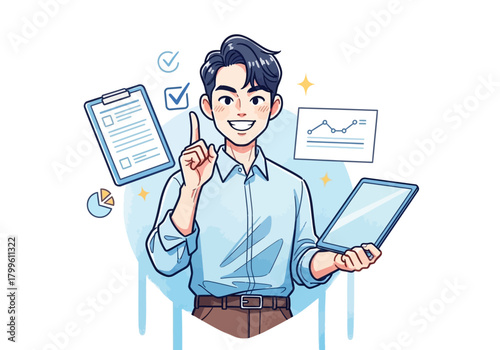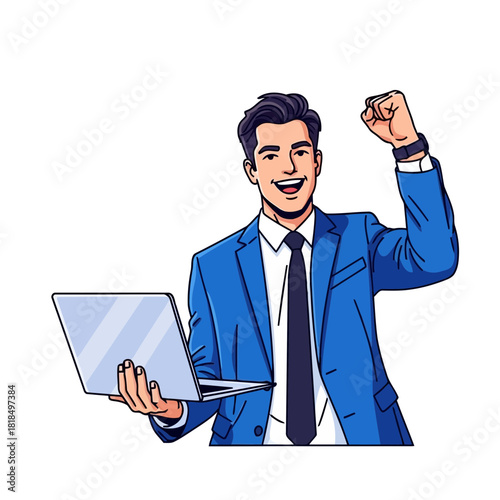 Vector illustration of businessman with tablet showing ok hand sign in retro pop art comic style.