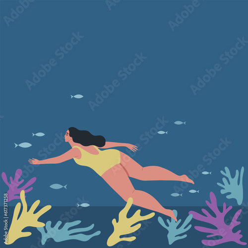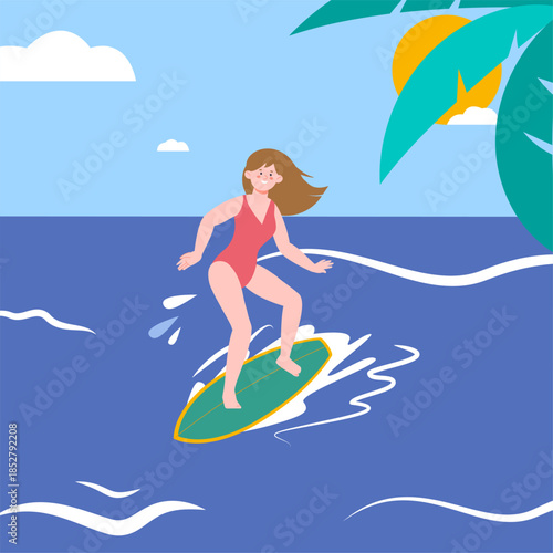 Vector illustration of businesswoman dreaming about holiday at the seaside in retro pop art comic style.