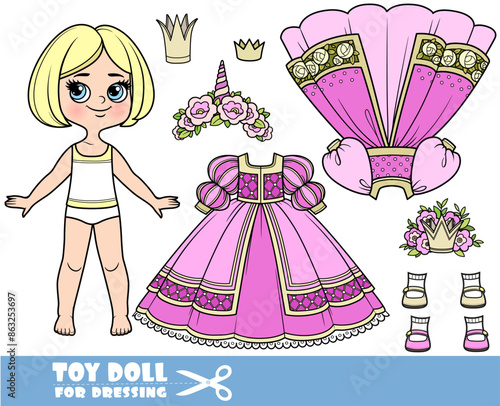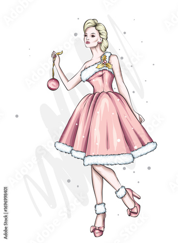 Vector illustration of pretty girl holding hanger with cocktail dress, speech bubble. Shopping concept design element in retro pop art comic style.