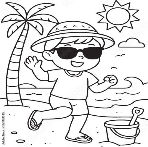 Vector illustration of kid girl playing with gold coins on beach. Kids savings concept poster in retro pop art comic style.