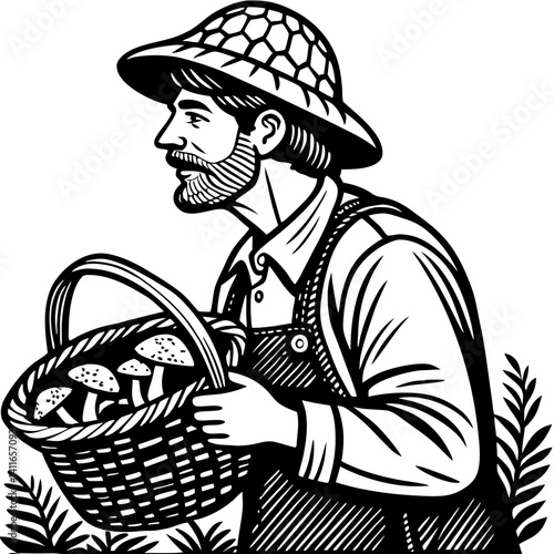 Vector illustration of smiling farmer holding tray with fresh vegetables. Gardener male in retro pop art comic style.