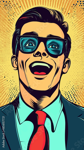 Vector illustration of laughing man, speech bubble. Happy face, positive emotion in retro pop art comic style.