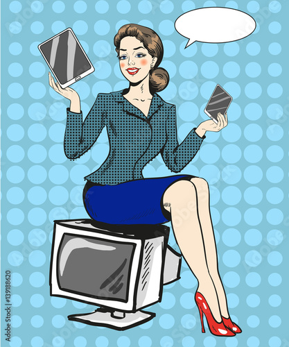 Vector illustration of young woman sitting on pile of books. Beautiful lady teacher, businesswoman reading book in retro pop art comic style.