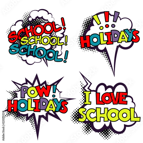 Vector set of vintage pop art patches, stickers and speech bubbles with fashion phrases and expressions Yep, Oh, Bam, Wow, Pop, Cool, New. Comic book sound effects.