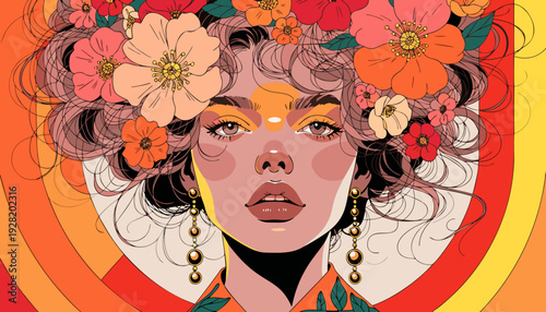 Vector illustration of beautiful young woman and peony flowers around her. Sexy pin-up girl in retro pop art comic style.