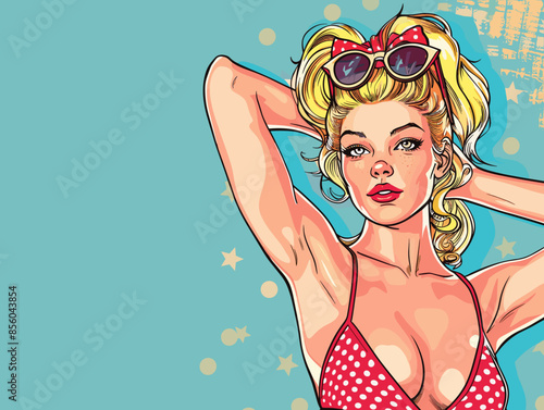 Vector illustration of pretty young woman in virtual reality glasses. Pin-up girl portrait in retro pop art comic style.