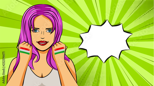 Vector illustration of pretty young girl showing cloud with raindrops. Sad woman with open palm hand gesture in retro pop art comic style.