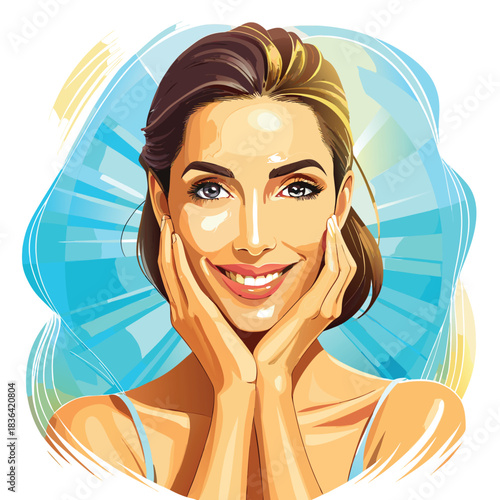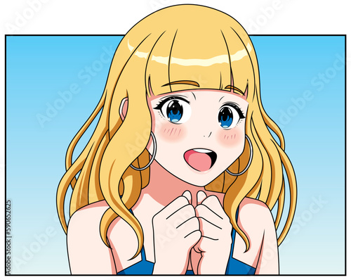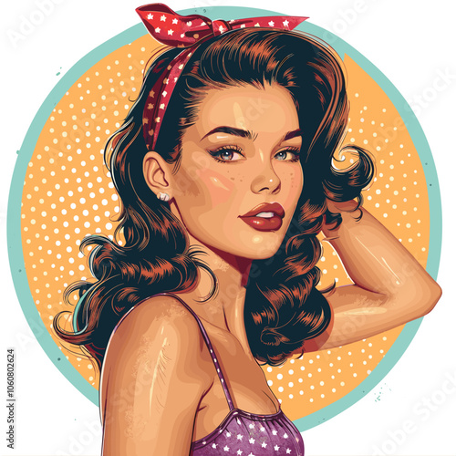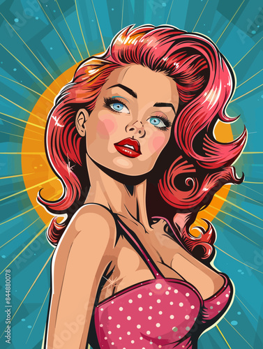 Vector illustration of smiling young girl showing victory or peace hand sign or gesture. Beautiful pin-up girl gesturing in retro pop art comic style.