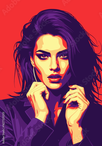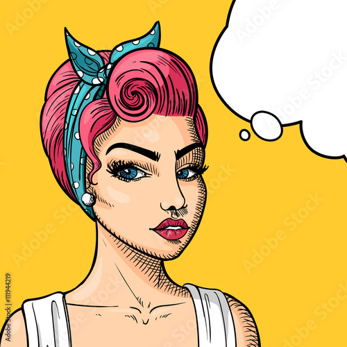 Vector illustration of beautiful woman pointing finger, boom speech bubble. Wonder girl gesturing in retro pop art comic style.