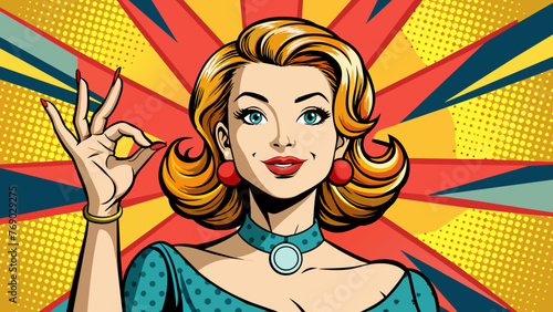 Vector illustration of beautiful woman holding price tag. Wonder girl portrait in retro pop art comic style.