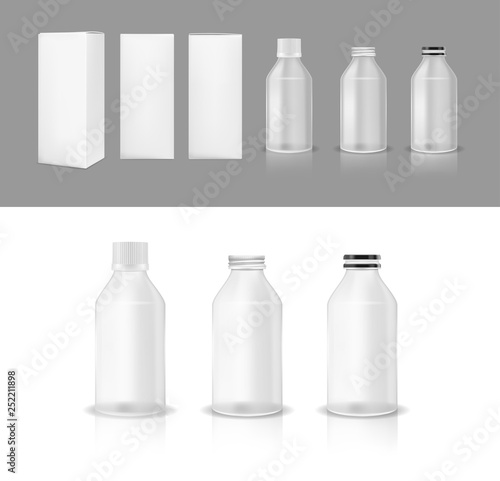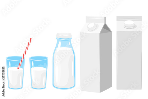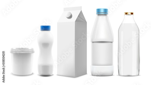 Vector set of realistic milk packaging templates. White creative milk paper, glass and plastic packaging design.