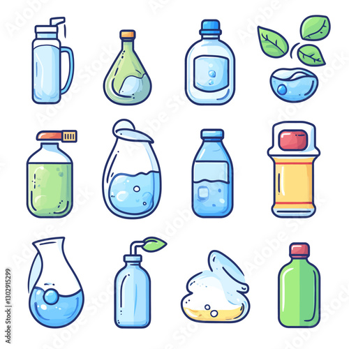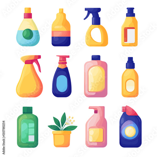 Vector set of realistic dishwashing liquid product icons isolated on white background. Plastic bottle label design. Washing-up liquid or dishwashing soap brand advertising templates.