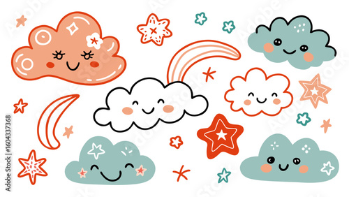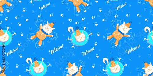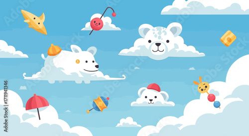 Vector seamless pattern with beautiful princess riding cute flying unicorn in the sky. Medieval cartoon characters background, wallpaper, fabric, wrapping paper.