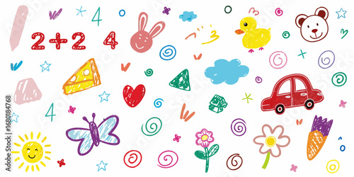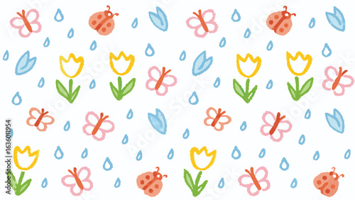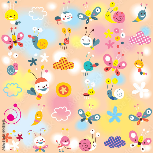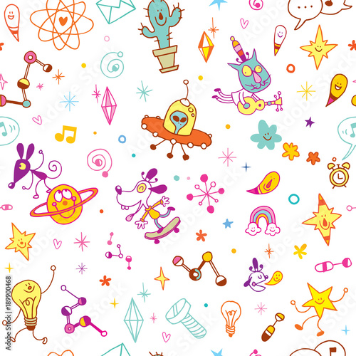 Vector seamless pattern with cute cats, autumn leaves, clouds with rain drops. Funny autumn cats background, wallpaper, fabric, wrapping paper.