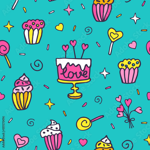 Vector seamless pattern with cute couple of cats in love. Happy romantic hugging kittens with hearts background, wallpaper, fabric, wrapping paper.