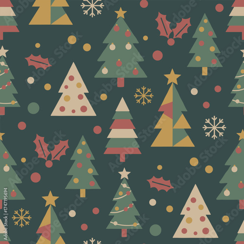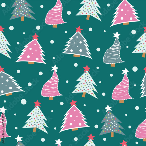 Vector seamless pattern with xmas trees, gift boxes and cute cat with reindeer antler headband on its head. Christmas cats background, wallpaper, fabric, wrapping paper.