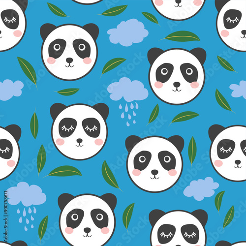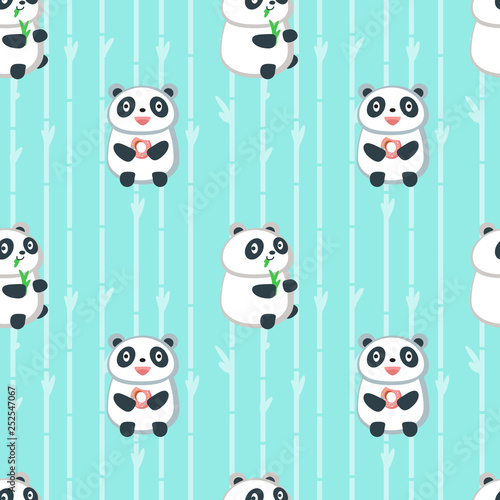 Vector seamless pattern with cute pandas eating bamboo leaves and donuts. Funny eating animals background, wallpaper, fabric, wrapping paper.
