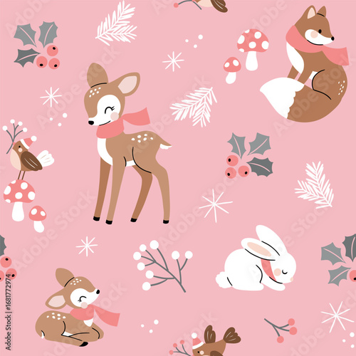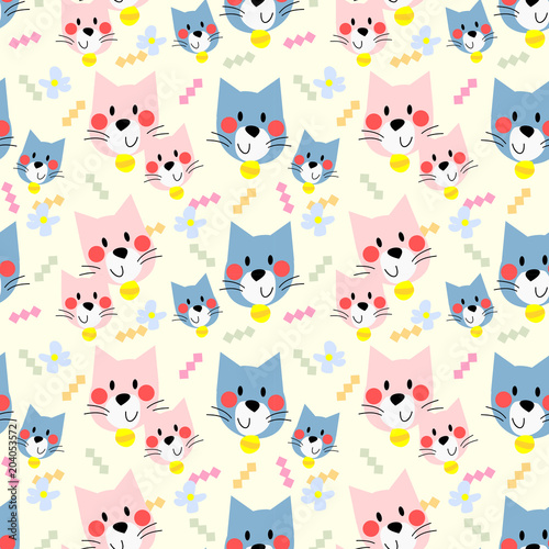 Vector seamless pattern with cute foxes with cake and cup of tea. Funny animals background, wallpaper, fabric, wrapping paper.