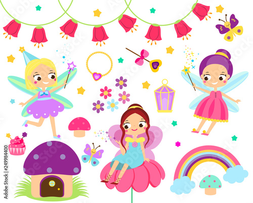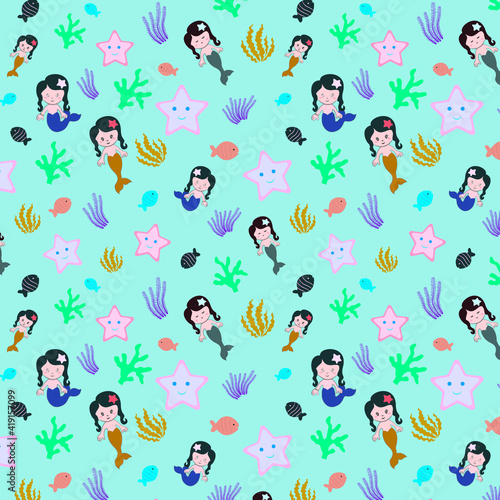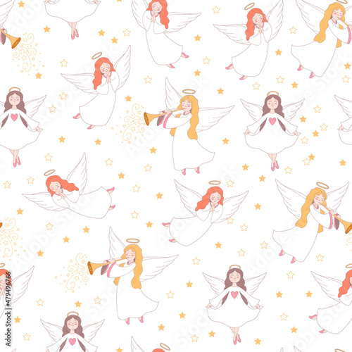 Vector seamless pattern with cute little girls, kind sorceresses, fairy tale characters doing magic using magic wand and potion. Childish enchantress background, wallpaper, fabric, wrapping paper.