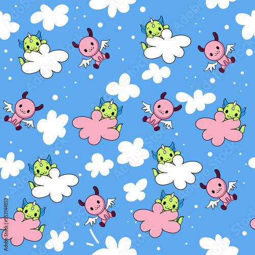 Vector seamless pattern with cute little bear, deer and raccon flying on airplane and biplane. Funny pilot animals background, wallpaper, fabric, wrapping paper.